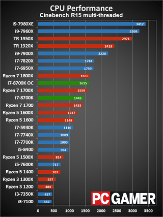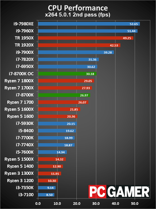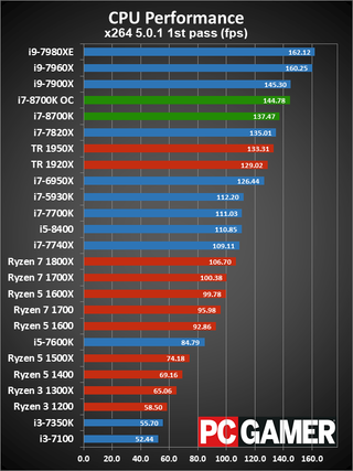 Even with one-third as many cores, the i7-8700K still provides more than half of the performance of the i9-7980XE. That's because it can run all six cores at 4.3GHz, pretty much all day long, where the 7980XE has to drop down to 3.4GHz (unless you overclock it). The high clockspeeds and higher performance architecture also push the i7-7800K ahead of all the AM4 Ryzen processors, though individual tests sometimes favor the Ryzen 7 chips. Meanwhile, applications that leverage AVX instructions—like the HWBOT x265 video encoding benchmark and y-cruncher—can heavily favor the Intel CPUs.