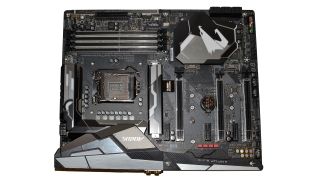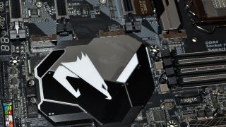 You can see the full list of test platforms above and to the right, and along with the processor we have a new motherboard for our Coffee Lake build. Gigabyte sent an Aorus Z370 Gaming 7 motherboard, a high-end design that includes plenty of bells and whistles. In addition to the usual stuff like SATA ports and the chipset, the motherboard includes premium audio, three M.2 slots for NVMe storage, and there's even a little fan hiding beneath the IO shroud. I used the F4a BIOS revision for this initial review.