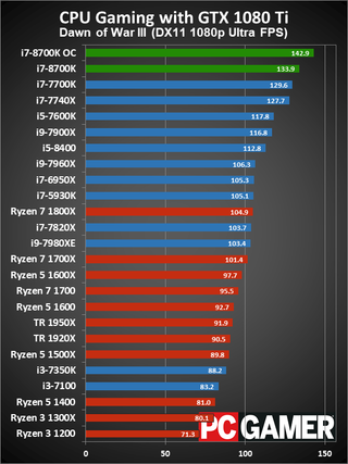 What's particularly interesting is how large the gap is in a few games. Civilization VI for example scales with CPU cores on AMD's Ryzen chips, but the previously tested Intel CPUs seem to hit a bit of a wall around 75 fps. The i7-8700K blows past that mark, reaching 86.6 fps at stock and 96 fps when overclocked. Dawn of War 3, Dishonored 2, and Mass Effect: Andromeda also show moderate scaling with faster processors, though there are clearly diminishing returns—and these would be even smaller with a slower GPU or a higher resolution. Overall, framerates improve by around seven percent compared to the i7-7700K.